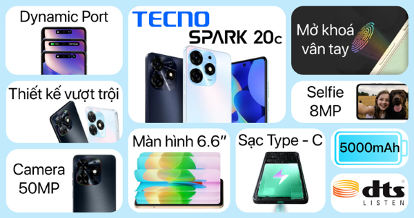 TECNO Spark 20C là một lựa chọn tuyệt vời trong phân khúc điện thoại giá rẻ. Máy sở hữu màn hình 6.6 inch với độ phân giải HD+, mang lại trải nghiệm hình ảnh sắc nét. Với bộ vi xử lý MediaTek Helio G36, 4GB RAM và bộ nhớ trong 128GB, TECNO Spark 20C có thể đáp ứng tốt các nhu cầu sử dụng cơ bản như lướt web, xem video và chơi game nhẹ. Điểm nổi bật của sản phẩm là pin dung lượng lớn 5000mAh, giúp bạn sử dụng thoải mái suốt cả ngày.