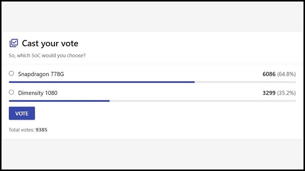 Tính đến thời điểm ngày 18-09-2023, tổng cộng đã có 9385 người tham gia bình chọn cho hai con chip Snapdragon 778G và Dimensity 1080.