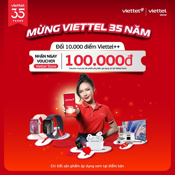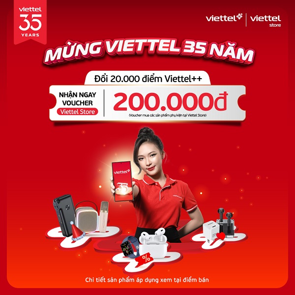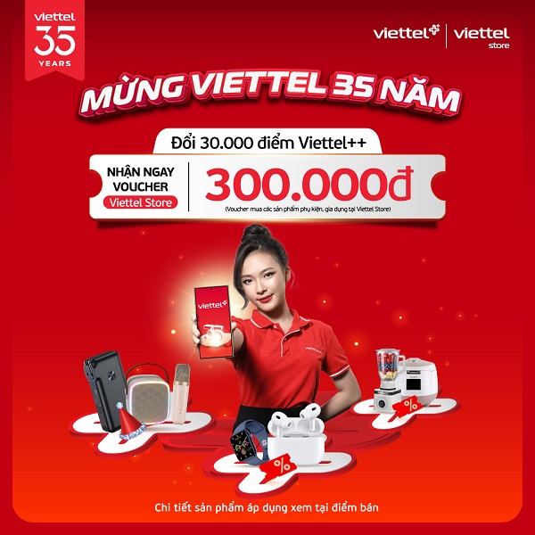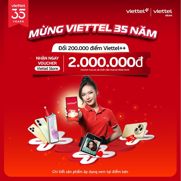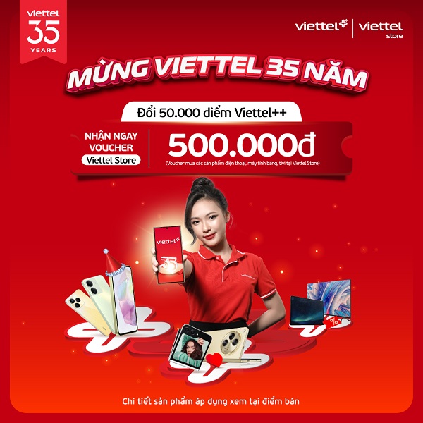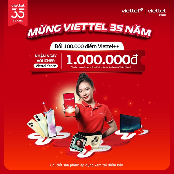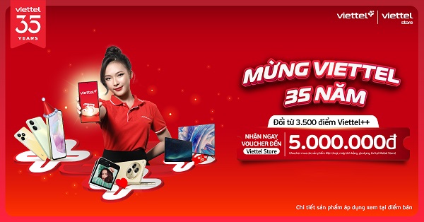 Chào mừng kỷ niệm 35 năm thành lập Tập đoàn Công nghiệp – Viễn thông Quân đội (Viettel), Viettel Store triển khai chương trình đổi điểm Viettel++ nhận ngay voucher đến 5.000.000đ áp dụng mua với các sản phẩm điện thoại, máy tính bảng, phụ kiện, tivi, gia dụng.