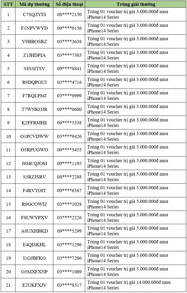 Viettel Store sẽ tổ chức quay số tìm ra khách hàng may mắn nhận voucher giảm giá đến 14 triệu đồng trên fanpage Viettel Store vào 18h ngày 13/10/2022. Danh sách khách hàng trúng thưởng sẽ được công bố vào 21h cùng ngày.