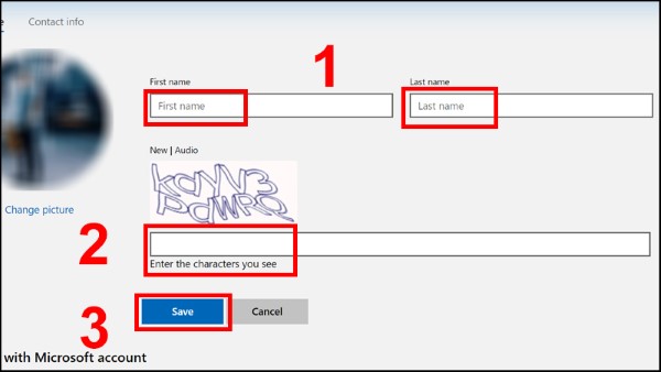 Bước 5: Nhập họ và tên mới vào First name và Last name > Nhập mã xác nhận > Click Save.