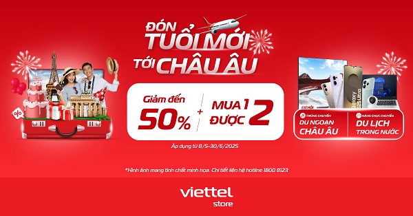 Từ ngày 08/05/2025 đến 30/06/2025, tất cả các khách hàng mua điện thoại, máy tính bảng, đồng hồ thông minh, laptop, phụ kiện, tivi, gia dụng, SIM số đẹp tại Viettel Store sẽ được áp dụng nhiều ưu đãi hấp dẫn cùng cơ hội trúng 01 chuyến du lịch Châu Âu trị giá 75.000.000 đồng/chuyến và 19 chuyến du lịch trong nước trị giá 8.000.000đ/chuyến.