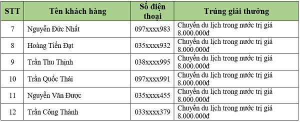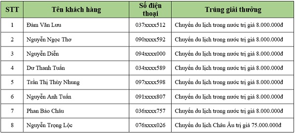 – Cách thức trao thưởng: Sau khi khách hàng trúng giải thưởng, đại diện siêu thị Viettel Store sẽ chủ động liên hệ, gọi khách hàng ra nhận giải và thỏa thuận thời gian thực hiện chuyến du lịch với khách hàng. Nội dung giải thưởng sẽ được thể hiện trong Biên bản trao thưởng kí giữa đại diện Siêu thị và khách hàng. Trong Biên bản trao thưởng thể hiện rõ giá trị giải thưởng (chuyến du lịch trong nước hoặc chuyến du lịch châu Âu – kèm giá trị giải thưởng tương ứng), thời gian sử dụng giải thưởng đã trúng (khách hàng phải chọn thời gian khởi hành trước ngày 31/08/2025). Sau khi kí Biên bản trao thưởng, Công ty sẽ gửi thông tin của khách hàng (Bao gồm tên + số điện thoại + thời gian khởi hành chuyến du lịch khách hàng đã chọn) cho công ty lữ hành.