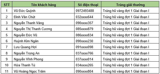 | STT | Tên khách hàng | Số điện thoại | Trúng giải thưởng |