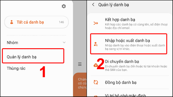 – Thẻ nhớ: Mở ứng dụng Danh bạ > Ấn vào biểu tượng 3 dấu gạch bên tay trái màn hình > Vào mục Quản lý danh bạ > Ấn Nhập hoặc xuất danh bạ > Vào mục (Nhập/Xuất) tùy vào thiết bị.