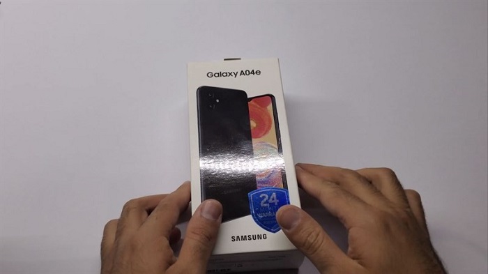 Là smartphone giá rẻ bình dân nên Galaxy A04e không được đầu tư quá nhiều về mặt thiết kế. Máy vẫn được đặt trong một chiếc hộp hình chữ nhật quen thuộc sử dụng màu trắng làm tone màu chủ đạo. Mặt trước in hình ảnh của máy, mặt sau là một số thông tin liên quan.