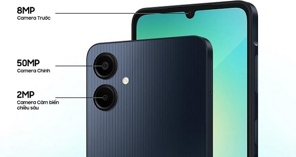 Ưu điểm nổi bật của Galaxy A06 là dù thuộc phân khúc giá rẻ nhưng hãng đã trang bị cho máy hệ thống camera cực khủng với Camera chính độ phân giải 50MP, camera chiều sâu 2MP. Nhờ vậy mà bạn hoàn toàn có thể dễ dàng lưu giữ lại những khoảnh khắc đẹp trong cuộc sống. Ngoài ra, camera trước của máy độ phân giải 8MP đáp ứng tốt nhu cầu selfie hoặc video call của người dùng.