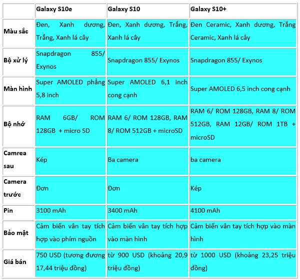 Dưới đây là bảng so sánh Galaxy S10e khác gì Galaxy S10 và S10+, mời bạn đọc cùng tham khảo: