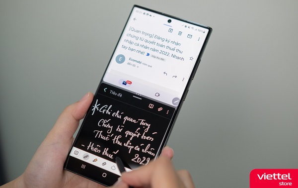 Tiếp đến là nhờ S Pen toàn năng giúp nâng cao hiệu suất làm việc và giải trí. Với độ trễ chỉ 2,8 mili giây, bạn có thể ghi trọn mọi thông tin, viết mail,.. một cách mượt mà và liền lạc. Thậm chí bạn còn có thể viết trực tiếp trên thanh tìm kiếm của các ứng dụng như Google Maps, Google Keep hay Facebook cực kỳ thú vị.