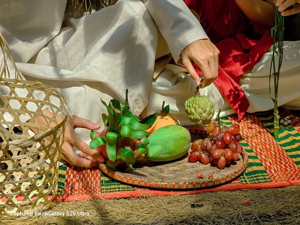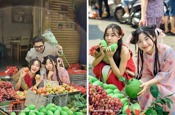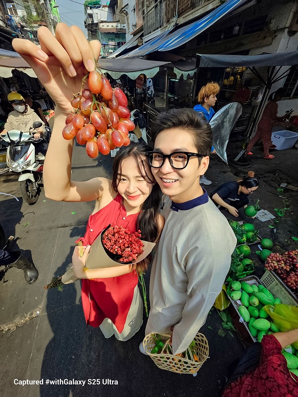Hay ví dụ như bức ảnh sau, cũng được chụp bằng camera góc siêu rộng trên Galaxy S25 Ultra, tái hiện sống động khung cảnh nhộn nhịp của một khu chợ Tết truyền thống. Ở tiền cảnh, chùm nho đỏ được giơ cao, làm tiêu điểm chính, đồng thời tạo chiều sâu và sự sinh động cho bức ảnh.