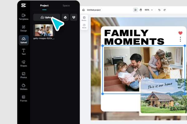 Khi đã chọn được mẫu mong muốn, bạn sẽ được chuyển đến giao diện chỉnh sửa của CapCut. Tại đây, nhấn vào mục “Tải lên” nằm bên cột trái của màn hình. Tiến hành chọn và đưa những bức ảnh gia đình yêu thích từ thiết bị của bạn vào thư viện dự án.