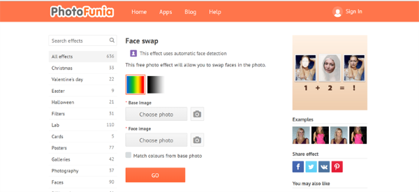 PhotoFunia là một nền tảng ghép mặt vào ảnh trực tuyến dễ sử dụng, tích hợp nhiều hiệu ứng hình ảnh thú vị, bao gồm cả tính năng hoán đổi khuôn mặt để tạo ra những bức ảnh ghép vui nhộn.