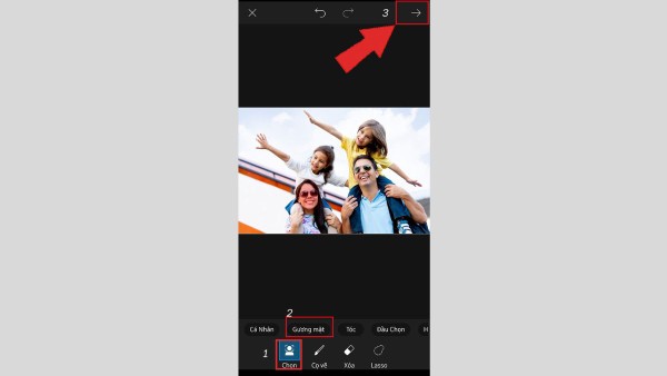 Bước 5: Chọn công cụ Chọn, sau đó nhấn vào mục Gương mặt. Tiếp tục nhấn vào biểu tượng mũi tên ở góc phải phía dưới để xem trước kết quả sau khi hoàn tất ghép mặt vào ảnh bằng PicsArt.