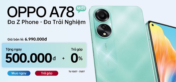 Được biết, OPPO A78 ra mắt tại thị trường quốc tế với giá bán là 200 EUR, còn giá bán chính thức OPPO A78 tại Việt Nam là 6.990.000 đồng và bạn có thể tìm mua sản phẩm tại các siêu thị của Viettel Store trên toàn quốc. Đặc biệt, trong thời gian từ 15/07 – 31/07/2023 khi đặt mua A78 bạn còn được giảm thêm 500.000 đồng cùng ưu đãi trả góp 0%.