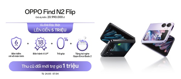 Thời gian áp dụng từ ngày 23/3 đến 7/4, nhanh tay đặt trước OPPO Find N2 Flip ngay hôm nay để nhận các ưu đãi hấp dẫn.