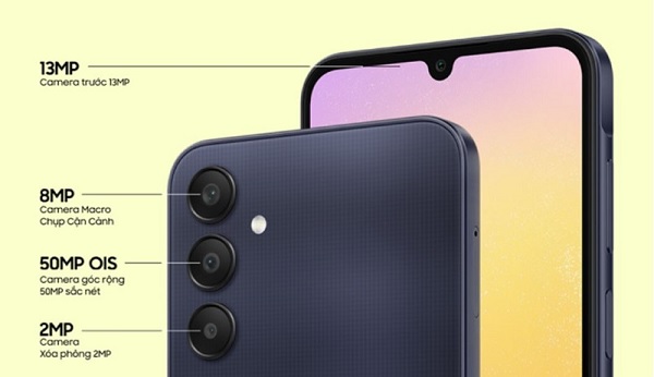 Về camera, Galaxy A25 5G được trang bị cụm camera khá ấn tượng gồm camera chính 50MP hỗ trợ OIS tiên tiến, camera góc siêu rộng 8MP và camera macro 2MP. Với thông số này, thiết bị hứa hẹn sẽ giúp bạn bắt trọn mọi khoảnh khắc đáng nhớ trong cuộc sống với chất lượng đẹp mắt.