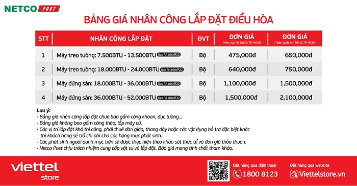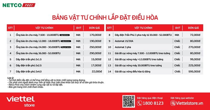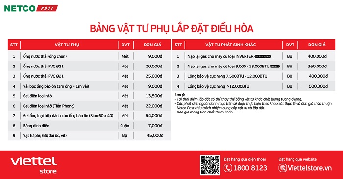 Khi mua và lắp đặt điều hòa, ngoài mức giá cùng ưu đãi hấp dẫn, Viettel Store còn kết hợp với đối tác Netco cung cấp bảng giá tham khảo giá lắp đặt và vật tư vô cùng có lợi nhằm đem đến những trải nghiệm tốt nhất cho khách hàng. Xem chi tiết ngay!