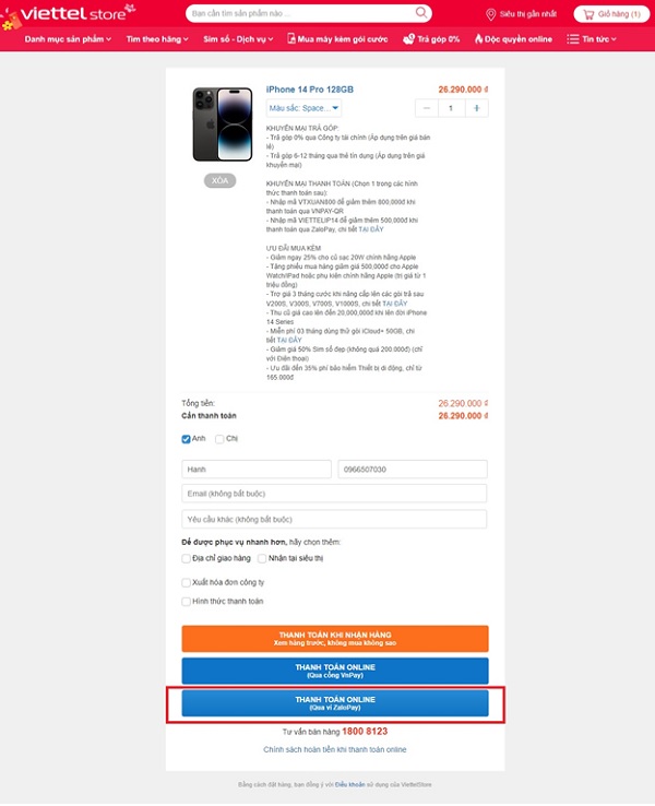 Bước 1: Khách hàng vào website viettelstore.vn lựa chọn sản phẩm bấm nút “Mua ngay” mua và lựa chọn thanh toán qua ví ZaloPay: