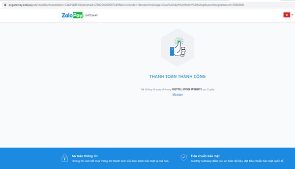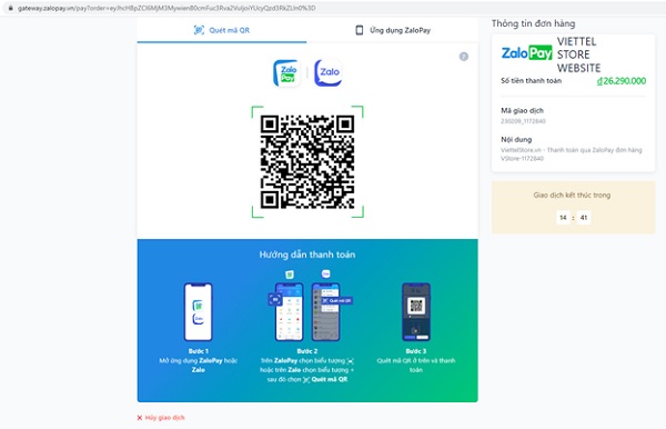 Hướng dẫn thanh toán đơn hàng qua ZaloPay trên Website viettelstore.vn