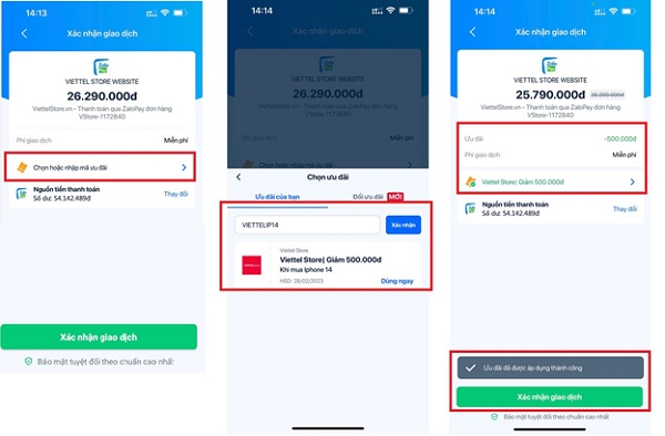 - Nhập mã “VIETTELIP14”: Giảm 500.000đ khi mua iPhone 14 series (chi tiết model liên hệ tổng đài 1800.8123) số lượng có hạn. KH quẹt tối thiểu số tiền 10 triệu đồng.
