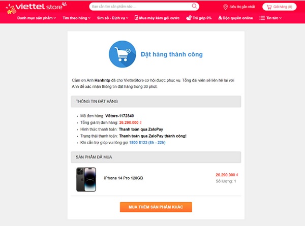 Và thông báo đặt hàng thành công trên website viettelstore.vn