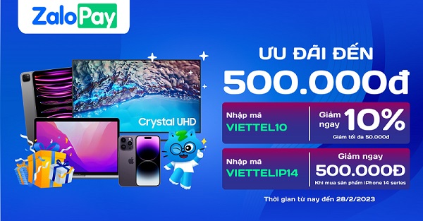 Giảm ngay đến 500.000 đồng khi thanh toán qua ZaloPay là chương trình mới nhất được Viettel Store triển khai áp dụng trong tháng 2 này. Nhanh chóng tham khảo ngay để không bỏ lỡ cơ hội mua sắm những món đồ công nghệ yêu thích với giá đã tốt nay còn tốt hơn tại hệ thống siêu thị Viettel Store trên toàn quốc nhé!