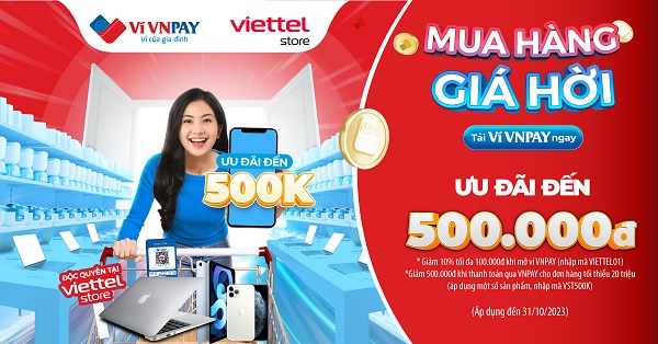 Trong tháng 10 này, khi mua một số sản phẩm công nghệ áp dụng có giá trị tối thiểu 20.000.000đ tại Viettel Store bạn sẽ được giảm ngay 500.000đ, giảm 10% tối đa 100.000đ khi mở ví mới.