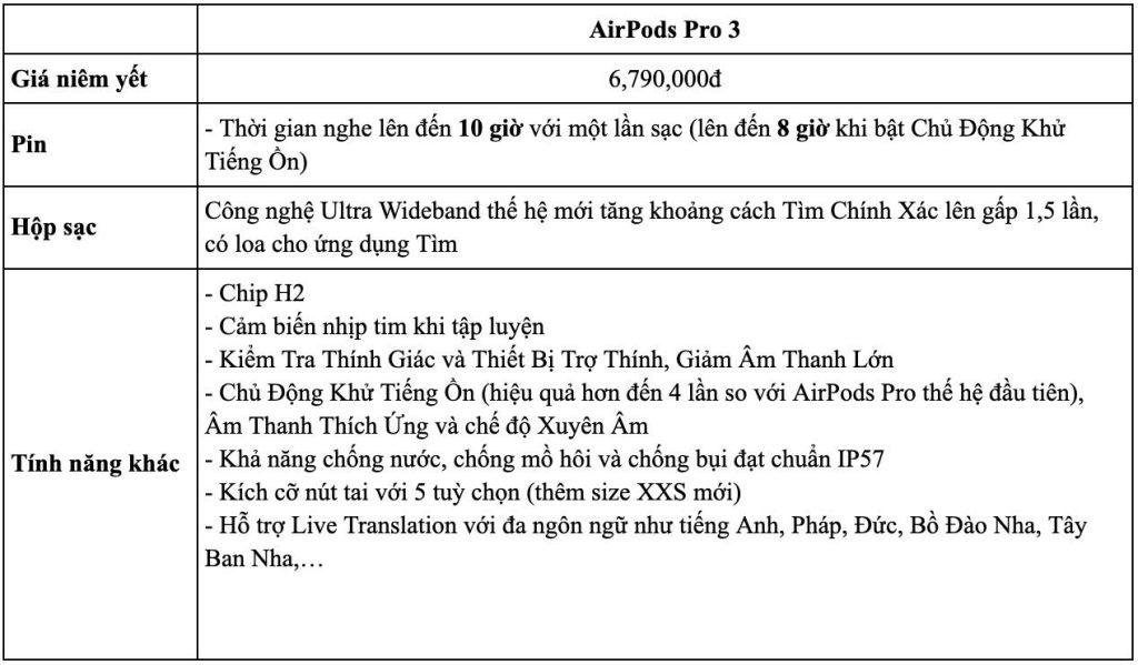 Đặt trước AirPods Pro 3 ngay hôm nay tại Viettel Store để nhận ưu đãi hấp dẫn: giảm ngay 500.000đ và sẵn sàng sở hữu siêu phẩm âm thanh mới nhất. Đặc biệt, sản phẩm sẽ có hàng từ ngày 27/09, giúp bạn nhanh chóng trải nghiệm công nghệ âm thanh đỉnh cao cùng thiết kế sang trọng, thời thượng. Đây chính là cơ hội tuyệt vời để nâng cấp tai nghe yêu thích của bạn với mức giá ưu đãi không thể bỏ lỡ.