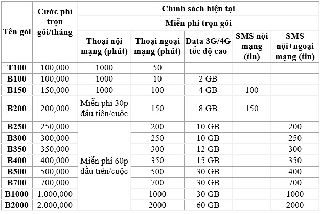 Thông tin tóm tắt về 1 số gói cước trả sau:
