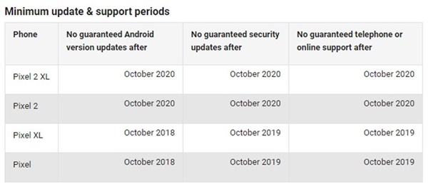 "Điện thoại Pixel 2 (2017) nhận được cập nhật phiên bản Android trong ít nhất ba năm tới kể từ khi thiết bị lần đầu tiên có mặt trên Google Store. Sau ba năm, chúng tôi không thể đảm bảo cập nhật thêm được nữa", trang hỗ trợ người dùng cập nhật. Cả phiên bản Android và bản cập nhật bảo mật sẽ được phát hành cho đến tháng 10 năm 2020, phía công ty cho biết.