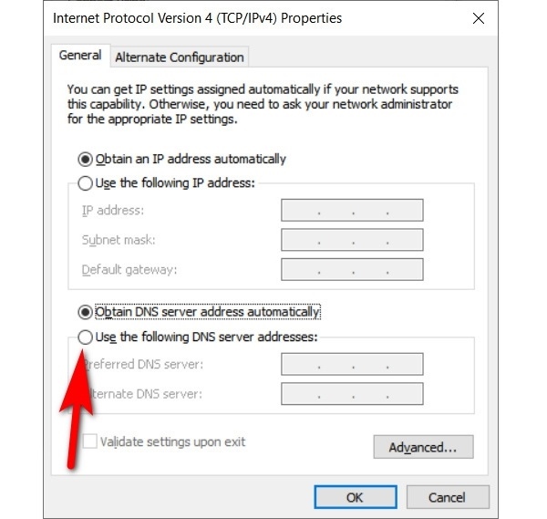 Bước 5: Trên giao diện Properties của Internet Protocol Version 4 (TCP/IPv4) hoặc Internet Protocol Version 6 (TCP/IPv6), chọn “Use the following DNS server addresses”.