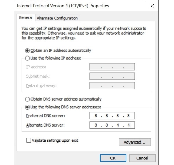 Nhập địa chỉ DNS Google vào các ô Preferred DNS server và Alternate DNS server.