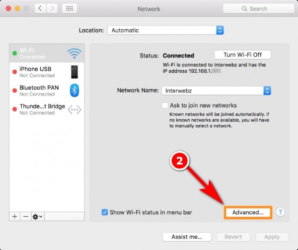 Bước 2: Chọn kết nối mạng mà bạn muốn cấu hình và thay đổi DNS. Ví dụ, để thay đổi cài đặt cho kết nối Wi-Fi, chọn Wi-Fi và nhấp vào Advanced (trên macOS Monterey và các phiên bản dưới đó).