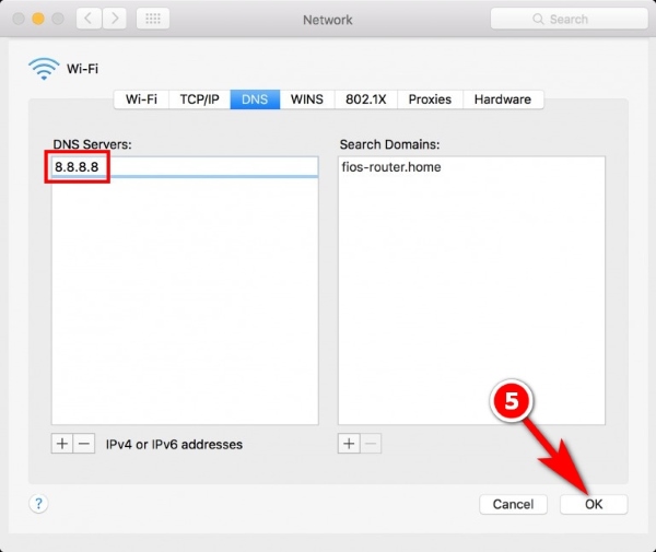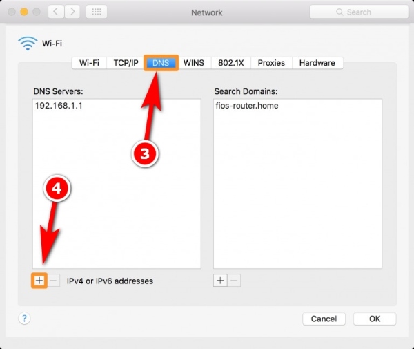 Bước 3: Chọn tab DNS. Nhấp vào + để thêm địa chỉ IP của DNS Google vào đầu danh sách hoặc thay thế bất kỳ địa chỉ nào hiện có.