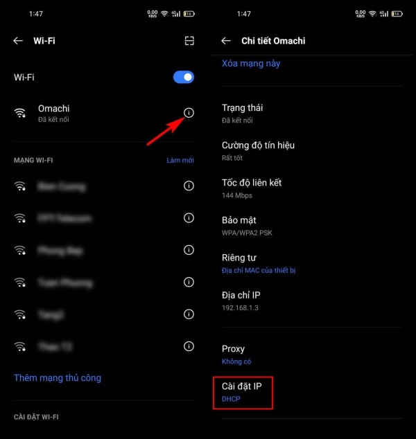 Bước 4: Kéo xuống và tìm mục Cài đặt IP. Chuyển từ Tự động (DHCP) sang Tĩnh (Static).