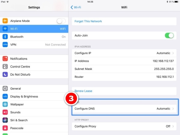 Bước 2: Nhấp vào biểu tượng chữ i bên cạnh mạng Wi-Fi mà bạn muốn thay đổi máy chủ DNS. Cuộn xuống và chọn mục DNS, sau đó nhấn Configure DNS (Định cấu hình DNS).