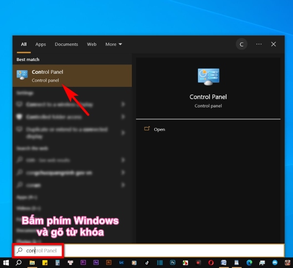 Bước 1: Truy cập Control Panel trên Windows. Một cách nhanh nhất là nhấn phím Windows để mở Start Menu, sau đó nhập “Control Panel” và chọn hộp thoại tương ứng.