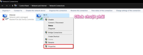 Bước 3: Chuột phải vào kết nối mạng muốn thay đổi DNS Google, sau đó chọn Properties (Thuộc tính).