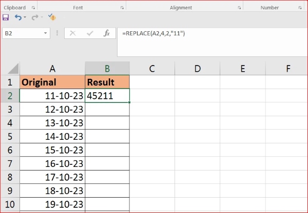 Trường hợp dữ liệu tham chiếu dưới dạng ngày tháng năm là “11-10-23” và người dùng muốn thay đổi tháng 10 thành tháng 11. Khi đó, nếu bạn chỉ sử dụng công thức hàm thông thường là “=REPLACE(A2,4,2,”11″)” thì kết quả trả về sẽ là “45211” không như mong muốn. Bởi thực chất “11-10-23” là hình ảnh đại diện cho tổng số ngày tháng “45210” nên hàm REPLACE khi thay đổi 2 số cuối cùng thành “11” thì sẽ trả về chuỗi văn bản là “45211”.