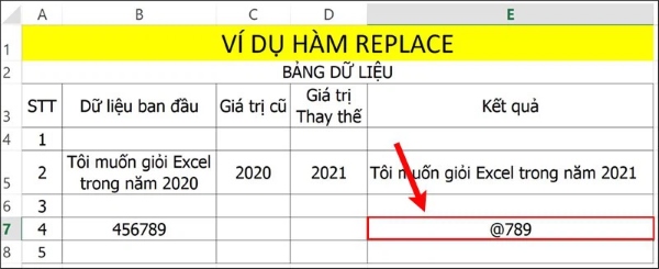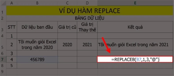 Ví dụ: Cần thay thế 3 ký tự đầu tiên là “456” trong dãy số 456789 ở ô B7 bằng ký tự “@” thì bạn làm như sau: