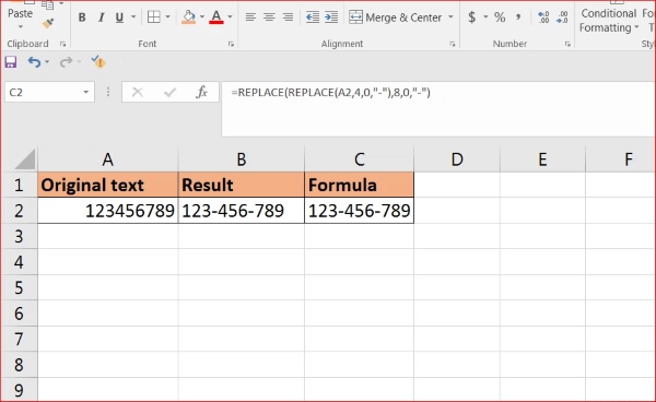 Bước 2: Tại ô C2, hãy nhập cú pháp hàm là: =REPLACE(REPLACE(A2,4,0,”-“),8,0,”-“) rồi nhấn ENTER để trả về kết quả là dãy ký tự “123-456-789”.