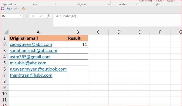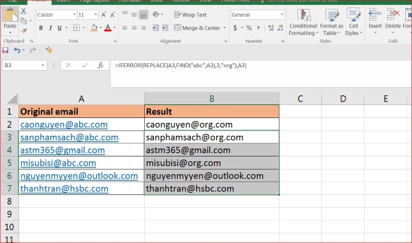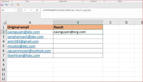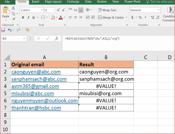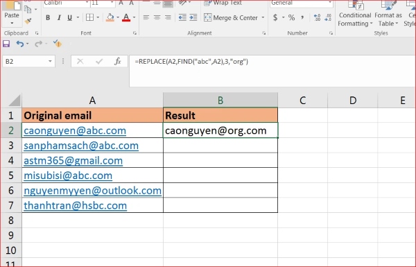 Ví dụ: Bạn đang có một danh sách địa chỉ email của khách hàng. Trong đó, có một khách hàng đã thay đổi tên miền từ “abc” thành “org” nên phải cập nhật lại các địa chỉ email mới theo yêu cầu. Khi đó bạn sử dụng hàm REPLACE và hàm FIND như sau: