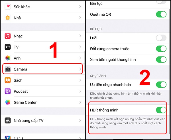 Người dùng vào phần Cài đặt >> Camera >> Bật HDR thông minh.