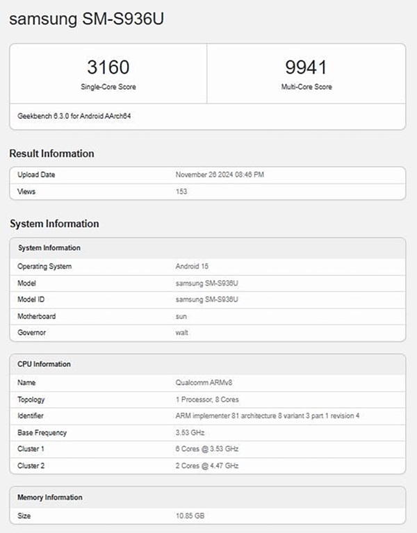 Danh sách Geekbench rò rỉ xác nhận Galaxy S25 Plus sẽ sử dụng con chip Snapdragon 8 Elite for Galaxy, xung nhịp 4.47 GHz, cao hơn một chút so với xung nhịp 4.32 GHz của phiên bản tiêu chuẩn. Đồng thời, chiếc smartphone này còn đi kèm với RAM 12GB giống như Galaxy S24 Plus. Dự kiến, dòng Galaxy S25 series sẽ được trình làng vào ngày 22 hoặc 23/1/2025.