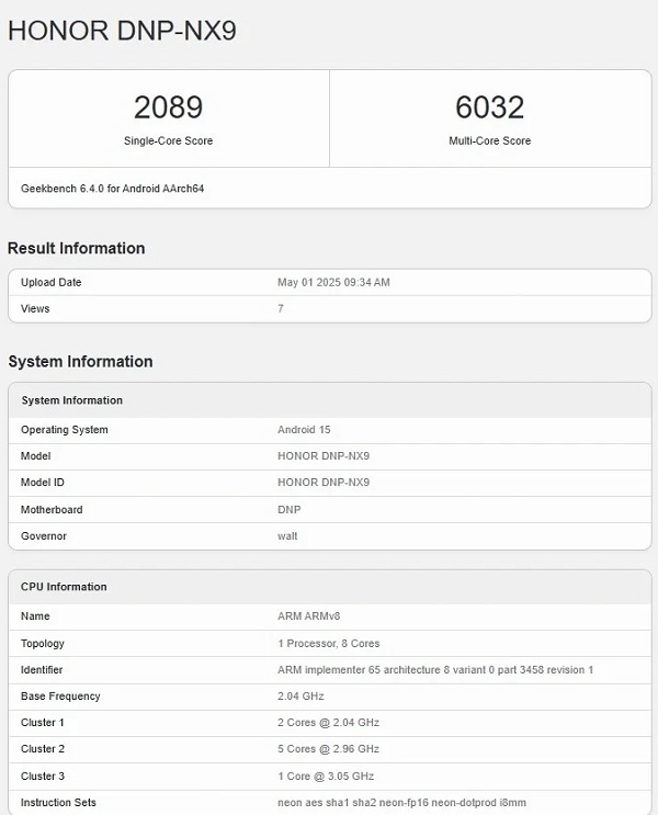 Với tên mã DNP-NX9, HONOR 400 Pro xuất hiện trên Geekbench được trang bị vi xử lý Snapdragon 8 Gen 3 đã được tối ưu hóa. Kết quả kiểm tra hiệu năng cho thấy thiết bị đạt 2.089 điểm đơn nhân và 6.032 điểm đa nhân, những con số rất ấn tượng trong phân khúc tầm trung cao cấp. Sự điều chỉnh này không chỉ giúp cải thiện nhiệt độ mà còn mang lại hiệu năng ổn định, đáp ứng tốt các tác vụ nặng mà không gây quá nhiệt. Đây là một điểm cộng lớn, đặc biệt đối với người dùng thường xuyên sử dụng các ứng dụng yêu cầu hiệu suất cao.