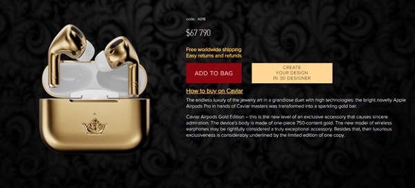 Phiên bản AirPods Pro Gold có giá “cực” đắt 67.790 USD (khoảng 1,58 tỉ đồng). Rõ ràng đây là con số khó để người dùng nói mua là cố được. Chính vì thế, Caviar đã ngầm chỉ định chủ sở hữu AirPods Pro Gold là giới thượng lưu.
