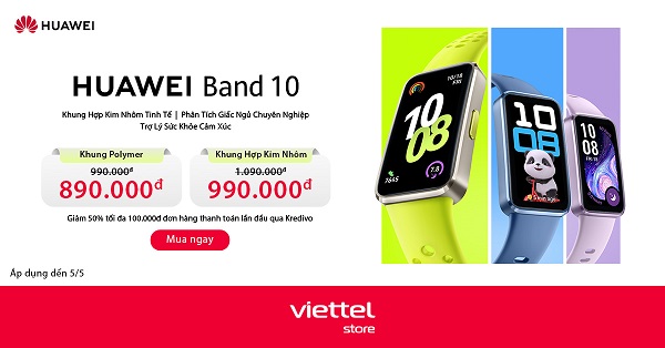 Từ nay đến 05/05, Viettel Store triển khai chương trình hotsale mở bán Huawei Band 10 – thiết bị đeo thông minh với thiết kế hiện đại, màn hình AMOLED sắc nét và nhiều tính năng theo dõi sức khỏe nổi bật như đo nhịp tim, theo dõi giấc ngủ và chế độ luyện tập đa dạng giá chỉ từ 890.000đ. Xem chi tiết thông tin đặt trước ngay!