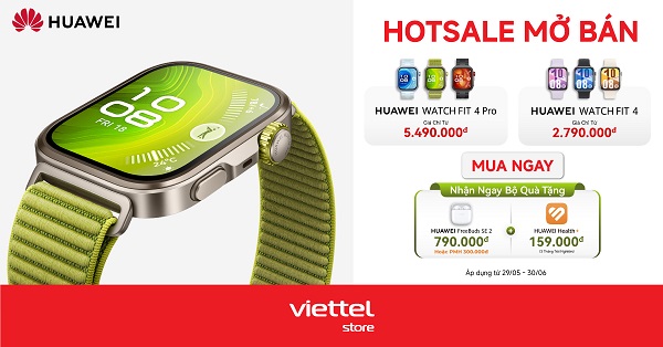Từ ngày 29/05 đến 30/06/2025, Viettel Store hân hạnh mang đến chương trình Hotsale mở bán Huawei Watch Fit 4 và Huawei Watch Fit 4 Pro với mức giá đặc biệt chỉ từ 5.490.000đ cùng những phần quà giá trị không thể bỏ lỡ. Đây là cơ hội hiếm có để bạn sở hữu các sản phẩm công nghệ cao cấp với những trải nghiệm tốt nhất dành riêng cho sức khỏe và phong cách sống năng động.