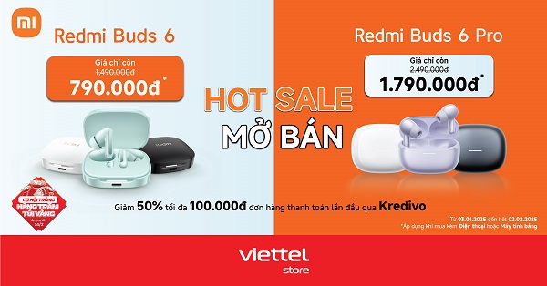 Từ ngày 03/01 đến 02/02/2025, Viettel Store triển khai chương trình hotsale mở bán Redmi Buds 6 và Buds 6 Pro với giá giảm chỉ còn từ 790.000đ. Xem chi tiết thông tin đặt mua ngay!