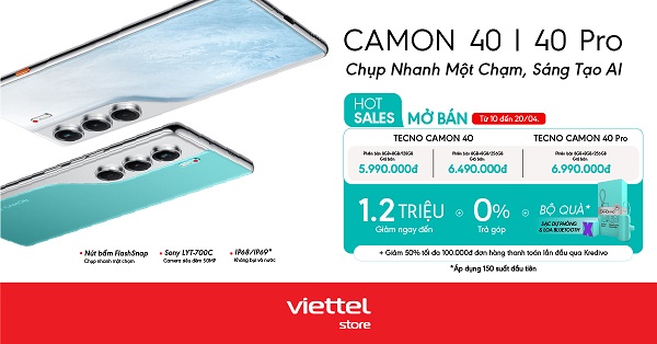Từ nay đến 20/04/2025, Viettel Store triển khai chương trình hotsale mở bán TECNO Camon 40 & 40 Pro giá bán lẻ chỉ 5.990.000đ, giảm ngay đến 1.200.000đ. Xem chi tiết đặt mua ngay chiếc smartphone “Chụp nhanh một chạm, sáng tạo AI” với giá tiết kiệm đến bất ngờ nhé!